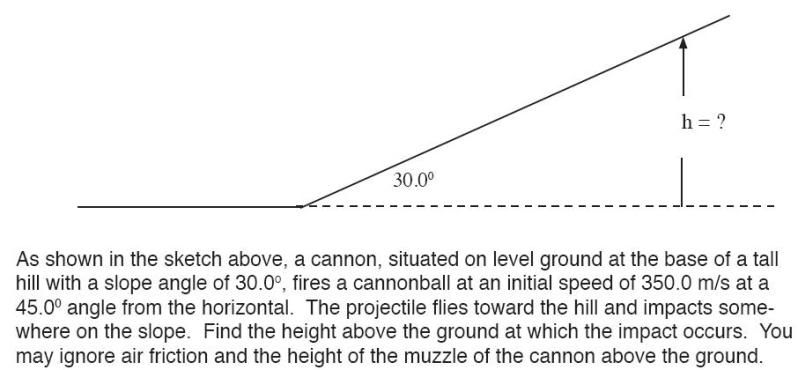 http://i80.photobucket.com/albums/j172/XwakeriderX/Cannon.jpg http://i80.photobucket.com/albums/j172/XwakeriderX/Cannon.jpg Just in case you cant read it Please go step by step As shown in the sketch above, a cannon, situated on level ground at the base of a tall hill with a slope angle of 30.0degree . fires a cannonball at an initial speed of 350.0 m/s at a 45.0degree angle from the horizontal The projectile flies toward the hill and impacts some where on the stope. Find the height above the ground at which the impact occurs. You may ignore air friction and the height of the mu zzle of the cannon above the ground.Explanation / Answer