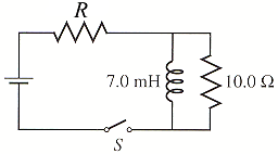 In the circuit below, a parallel combination of a 10.0-? resistor and a 7.0-mH inductor is connected in series with an R =3.5-? resistor, a 8.0-V dc battery, and a switch. After the switch has been closed for a very long time, it is opened.