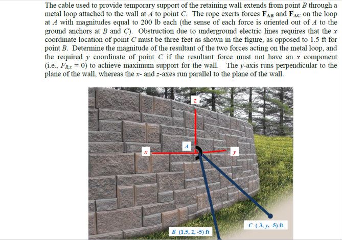 The cable used to provide temporary support of the retaining wall extends from point B through a metal loop attached to the wall at A to point C. The rope exerts forces FAB and FAC on the loop at A with magnitudes equal to 200 lb each (the sense of each force is oriented out of A to the ground anchors at B and C). Obstruction due to underground electric lines requires that the x coordinate location of point C must be three feet as shown in the figure, as opposed to 1.5 ft for point B. Determine the magnitude of the resultant of the two forces acting on the metal loop, and the required y coordinate of point C if the resultant force must not have an x component (i.e., FR,x = 0) to achieve maximum support for the wall. The y-axis runs perpendicular to the plane of the wall, whereas the x- and z-axes run parallel to the plane of the wall.