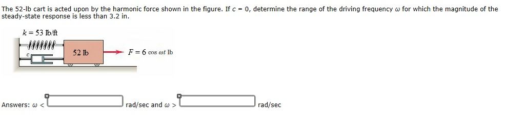 The 52-lb cart is acted upon by the harmonic force shown in the figure. If c = 0, determine the range of the driving frequency ? for which the magnitude of the steady-state response is less than 3.2 in.Explanation / Answer