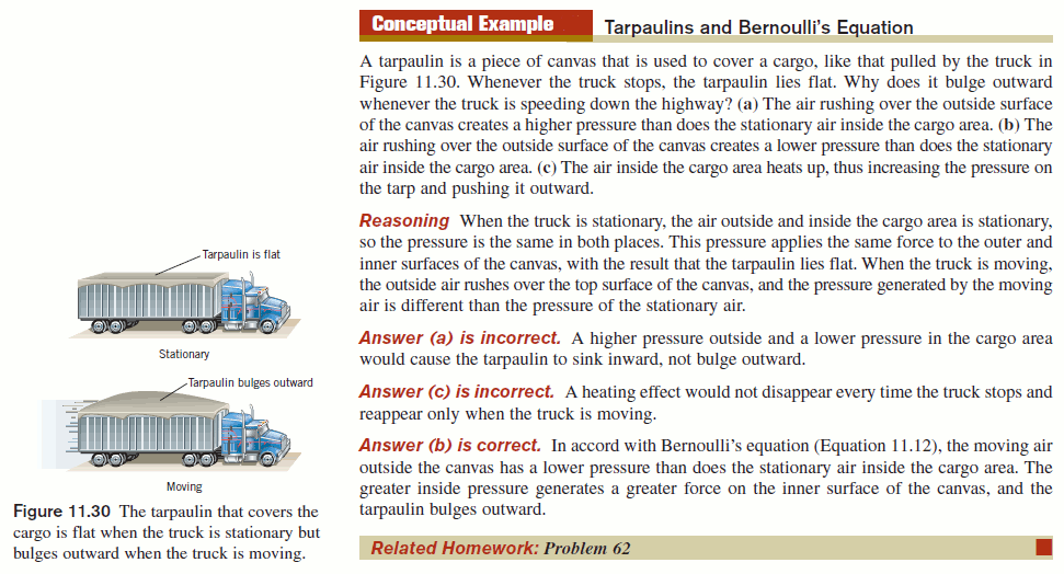 1- Review this conceptual example before attempting this problem. The truck in that example is traveling at 35 m/s. The density of air is 1.21 kg/m3. By how much does the pressure inside the cargo area beneath the tarpaulin exceed the outside pressure?